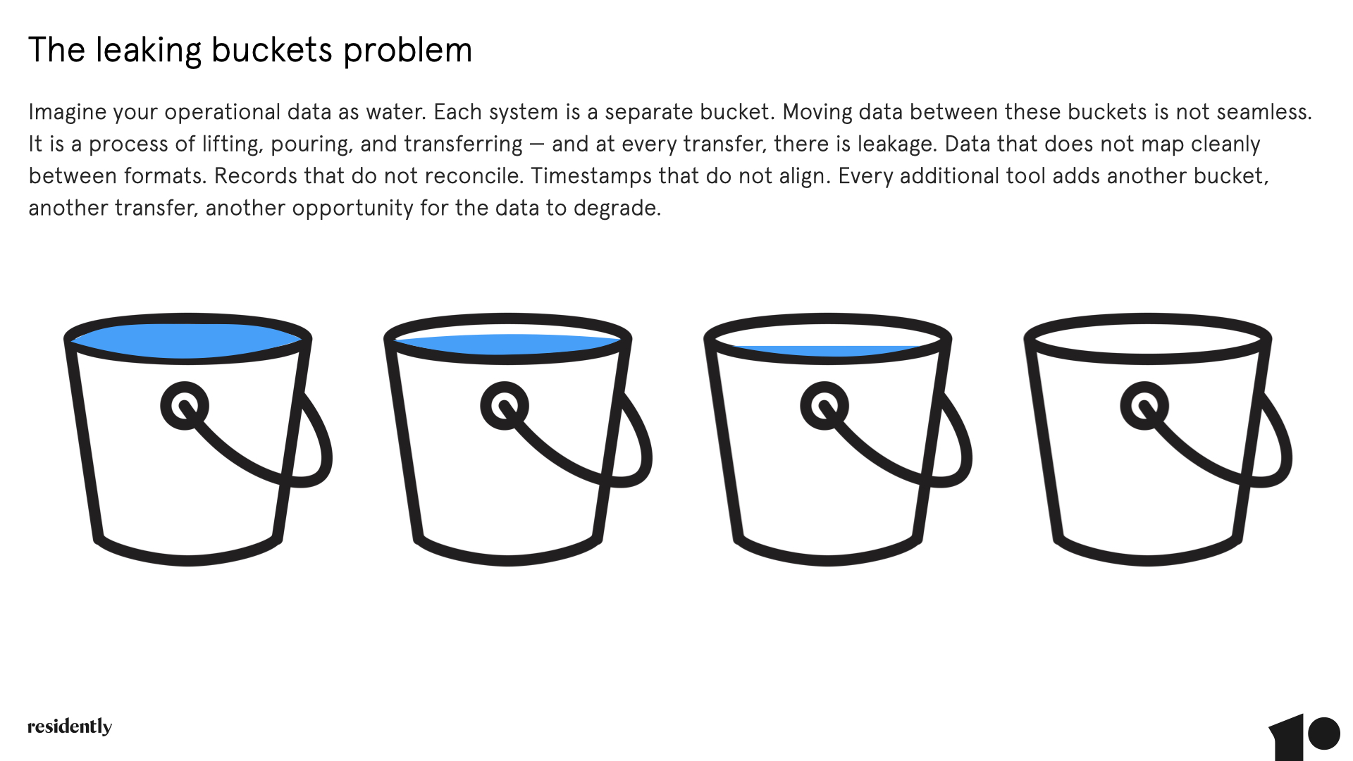 The analogy is direct: imagine your operational data as water. Each system — your PMS, your leasing tool, your maintenance platform, your communications suite — is a separate bucket. Moving data between these buckets is not seamless. It is a process of lifting, pouring, and transferring — and at every transfer, there is leakage. Data that does not map cleanly between formats. Records that do not reconcile. Timestamps that do not align. Every additional tool adds another bucket, another transfer, another opportunity for the data to degrade.